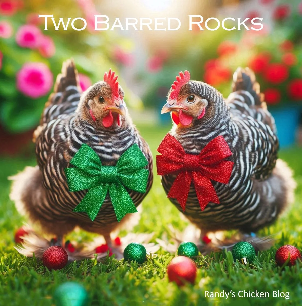 Four calling roos, Three French hens, Two Barred Rocks, And a rooster in a pear tree.