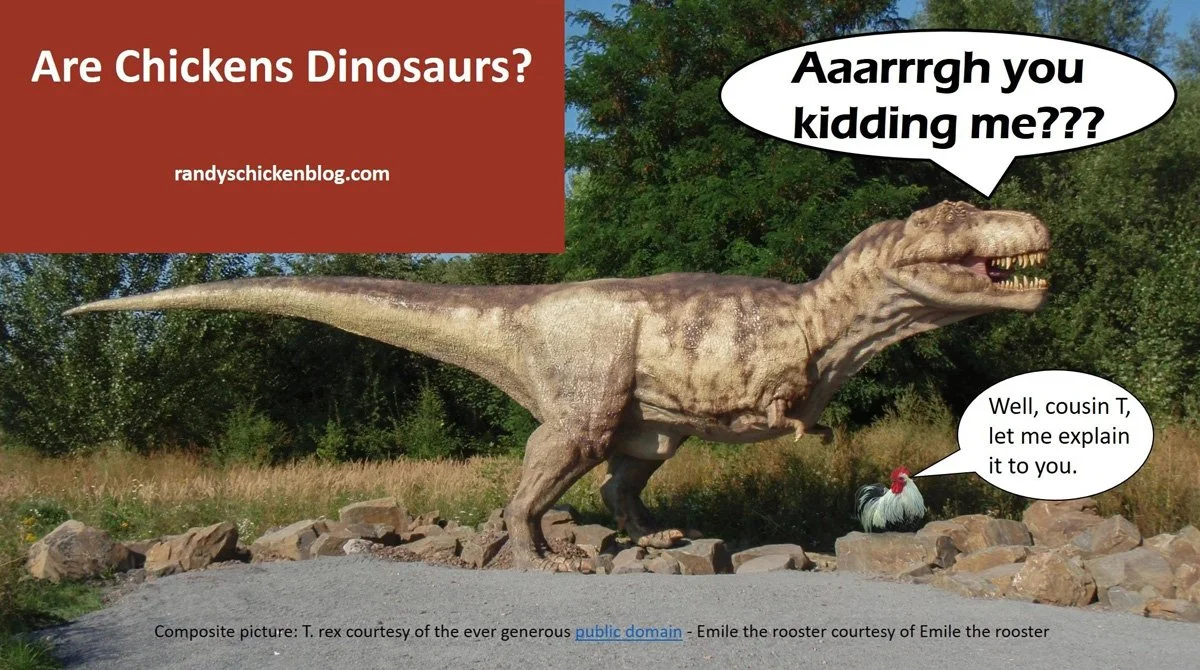 After a lot of research and reading, I wrote my chicken/dino article in 2018. Are Chickens Dinosaurs is short and to the point and explains that practically every expert in the field has concluded that chickens really are dinosaurs—as are all birds. And, nope, chickens are not the closest living relative to T. rex.